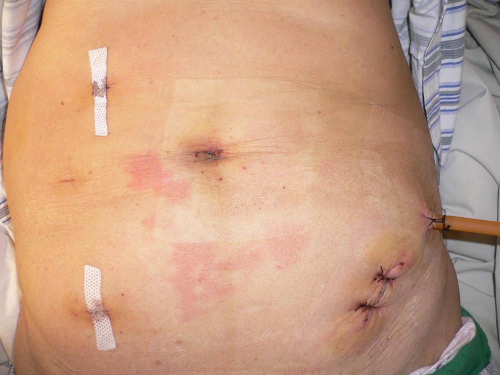 傳統開腹手術切口通常在25cm左右(見手術照片2),患者術后疼痛重,下地活動晚,多數需要3-4天才能下地活動,并且需要他人的攙扶,不利于腸功能的恢復及下肢靜脈血栓形成的預防等。住院時間長,通常需要2周左右,大大增加了陪護人員的工作量。腹腔鏡輔助手術的切口通常在5cm左右,與闌尾炎的手術切口相當,術后疼痛輕,通常術后第1天即可自行下地活動,腸功能恢復快,可早期拔除胃腸減壓管及早期進食。住院時間短,約在1周左右。大大減輕陪護人員的工作量。由于切口小,切口裂開的發生率大大減少。